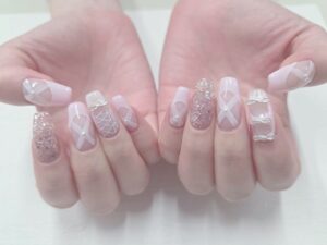 今回のデザインは、指先に透明感を出す“ミルキーピンク”をベースに、リボンや編み上げ風のアート、ラメを組み合わせることで、華やかさと可愛らしさのバランスを絶妙に仕上げています。特に、クロスリボンをモチーフにしたデザインは、シンプルな中にも存在感があり、手元を綺麗に見せたい方から人気の高いアートです!