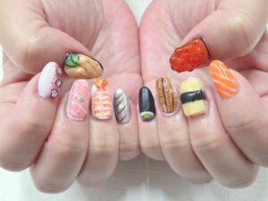 いくら、サーモン、たまご、えび、うなぎなど、人気の寿司ネタをネイルアートでリアルに再現した、遊び心あふれる個性派ネイルです。